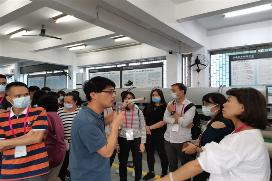 随后,在交通学院志愿者的引领下,代表团来到了高速列车研究中心(即轨道交通安全教育部重点实验室),参观动模型试验台、实车撞击试验台,由交通学院高速中心张老师、周老师负责介绍。