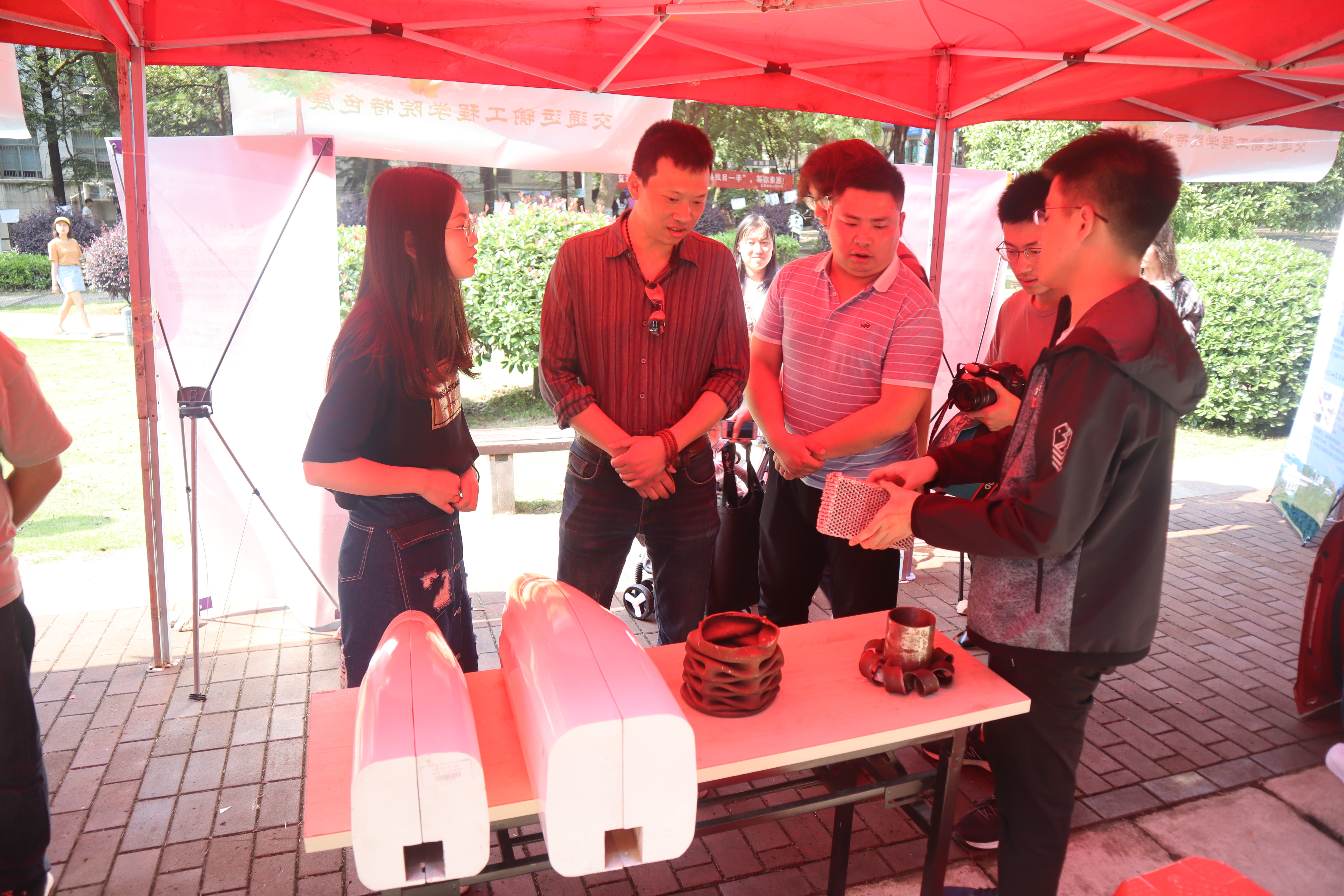 在团队风采与研究成果展示点处,有对先进轨道交通科普基地的专家团队和志愿者团队与高速列车研究中心代表性科研成果的介绍展板,并有相关科研成果的试验模型。通过胡裕松、赵亚星等志愿者同学的全程讲解服务,让更多的人了解先进轨道交通知识。