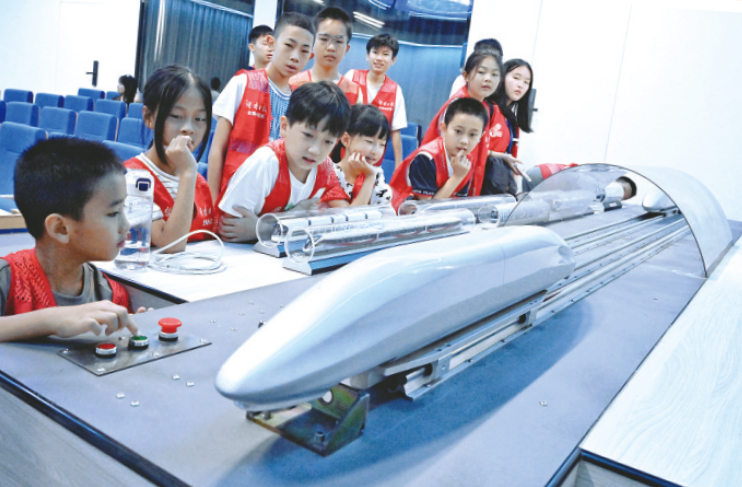 离开科普展示厅,康欣老师带着同学们来到高速列车研究中心。在这里同学们看到了研究中心自主研制的世界上试验速度最快“列车气动性能模拟动模型试验装置”这个试验装置可不简单,它已完成了数十种具有自主知识产权的列车流线型外形的设计!