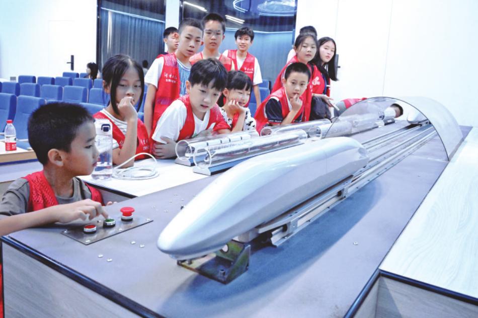 铁道学院大学生讲解员胡钰瑶早早地就在科普馆内等候,期待着与《放学后》的小读者和湖南日报全媒小记者一同探索火车变形的奥秘。在结束了校园、高速列车研究中心列车气动特性和轨道车辆碰撞实验室参观后,同学们的小本子上密密麻麻地记录着他们的疑惑与好奇。一见到胡钰瑶老师,他们便迫不及待地抛出了心中的问题:“高铁车头为什么像‘子弹头’?”“高铁的窗户为什么不能打开?”“高铁的轨道和普通火车的轨道有何不同?”面对小朋友们的热切提问与思索,胡钰瑶老师笑了笑,竖起了大拇指,随即为大家播放了一段视频。