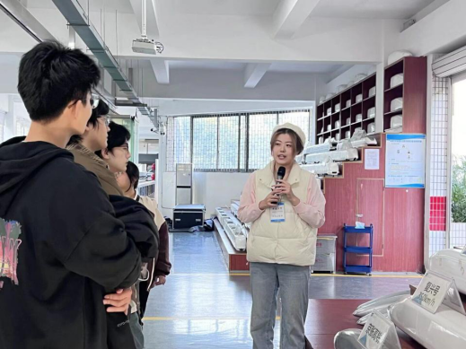 随后,一行人来到气动与碰撞实验室,就被地铁、高铁模型吸引。“平时大家对风肯定会有所感知的,而且明显能感觉到风的强弱和我们的速度相关”志愿者朱爱媛以生活中遇到的事情为例,为大家讲解空气动力学与列车运行原理;在碰撞试验台,朱爱媛为大家讲解了碰撞试验的整体流程,引用“弹弓”的比喻,巧妙地形容空气炮发射装置,引发大家对列车速度、质量、可能碰撞的角度等多方面的激烈讨论。