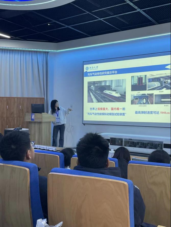 随后,师生走进气动实验室,由志愿者王文月进行讲解,通过列车模型与实验设备,直观感受列车在高速运行过程中的空气动力学特征,激发了同学们对工程技术的浓厚兴趣。在碰撞实验室,同学们参观了碰撞试验台,了解其在列车安全性能测试中的重要作用。王文月重点介绍了试验台的创新功能,让大家认识到轨道交通装备在安全性能方面的严谨设计。