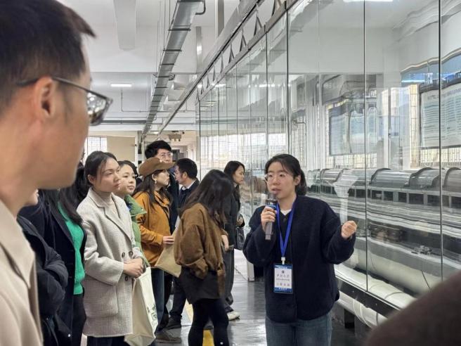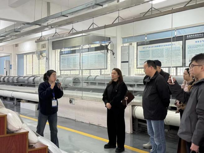 气动实验室内,参观人员参观了传统轮轨列车动模型试验台,详细了解高速列车空气动力学研究方法。通过动模型展示,参观人员直观认识到空气阻力、气动噪声和侧向风对高速列车运行安全与舒适性的影响,进一步理解了流线型车头设计和气动性能优化在高速铁路发展中的重要作用。