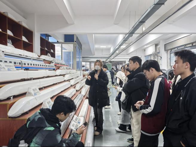 在气动实验室,学生们参观了高速列车动模型试验装置。讲解人员结合模型运行演示,介绍了列车高速交会、穿越隧道等工况下空气流动对列车稳定性和舒适性的影响,并引导学生思考列车外形设计与工程性能之间的关系,加深了对空气动力学工程应用的理解。