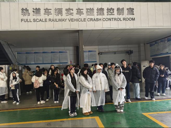 在轨道车辆实车碰撞试验室,讲解人员围绕实车碰撞试验平台,向学生介绍了列车安全试验的研究目的和实施方式。通过对防爬装置、吸能结构及碰撞后车体形变情况的讲解,学生们理解了列车安全并非“偶然可靠”,而是建立在大量试验数据和工程验证基础之上的科学结果。