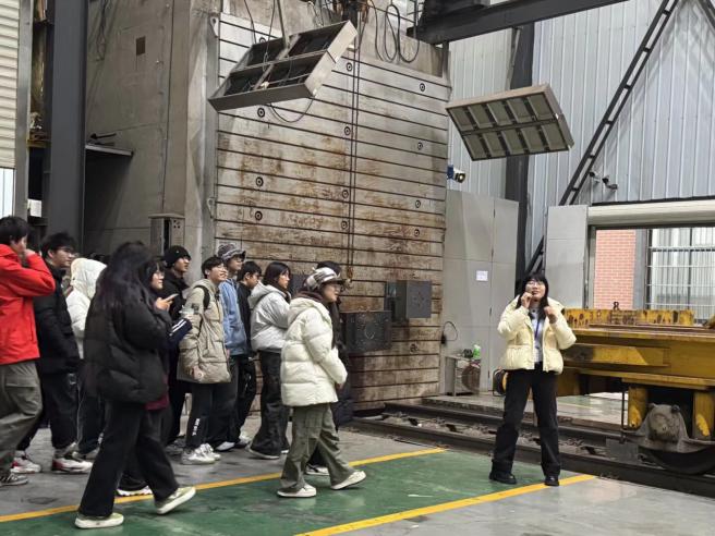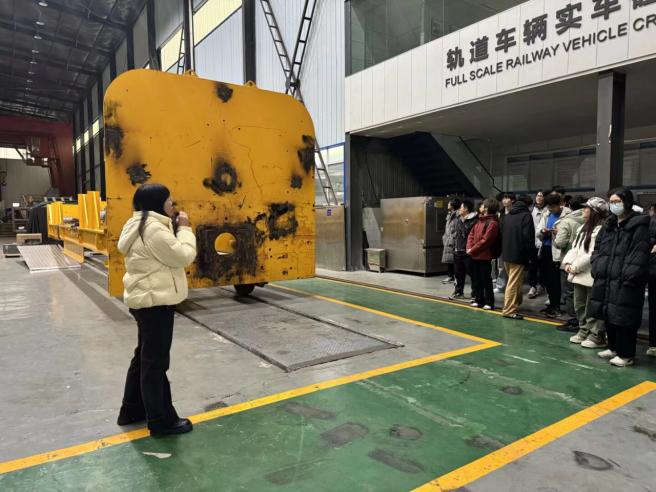 在轨道车辆实车碰撞试验室,讲解人员介绍了实车碰撞试验的研究目的和实施流程,并重点讲解了防爬装置、吸能结构在保障运输安全中的作用。同学们通过现场观摩碰撞后的列车部件,进一步认识到必赢亚洲
