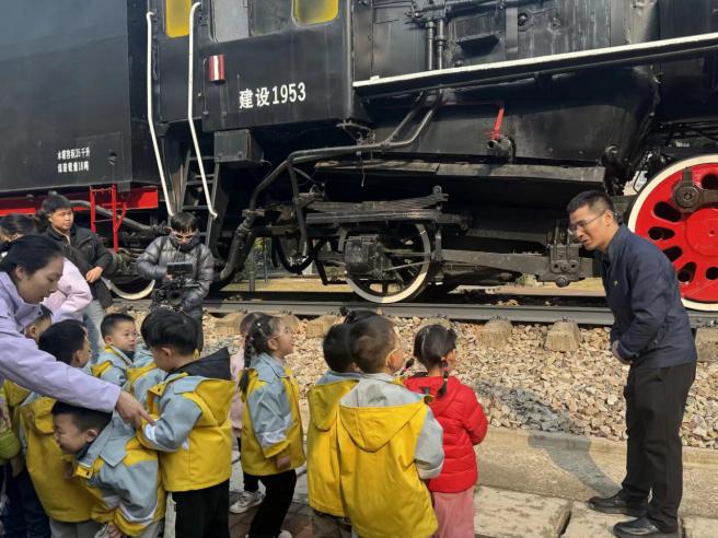 在铁路园,小朋友们近距离观察了不同类型的铁路机车。讲解人员结合实物,用通俗、生动的语言向孩子们介绍机车的外观特点,引导幼儿通过“看一看、找一找”的方式进行观察,激发了孩子们对铁路和交通工具的兴趣。