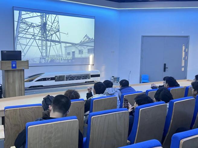 在气动实验室,团支部成员参观了高速列车动模型试验平台。讲解人员结合模型运行,介绍了空气动力学在高速铁路领域的应用场景,并引导同学们思考自动化、控制技术与轨道交通工程之间的融合关系,拓展了专业学习视野。